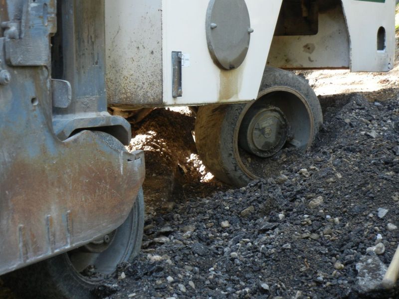 Dabei handelt es sich um eine extrem steile Zufahrt zu den dortigen Wohnhäusern. Beim Zurückfahren kam die rund 15 to schwere Maschine mit einem Rad in die gefräste Künette und blieb darin stecken. Die Feuerwehr konnte nur mit Hilfe eines Greifzuges die Baumschine aus dieser Lage befreien.