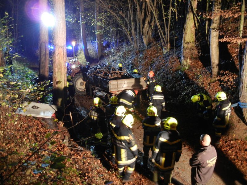 Am 28.10.2013 wurde die Feuerwehr Markt Piesting gegen 19.10 Uhr zu einer Traktorbergung in den Föhrenweg gerufen. Ein Trumauer Landwirt hatte auf seinem Traktorgespann am Nachmittag Holz verladen.